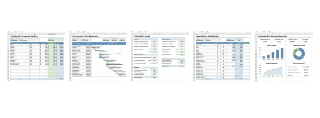 Ferramentas utilizadas no dia a dia profissional para orçamento detalhado, cronograma físico-financeiro, dimensionamentos estruturais e controle preciso das etapas construtivas.