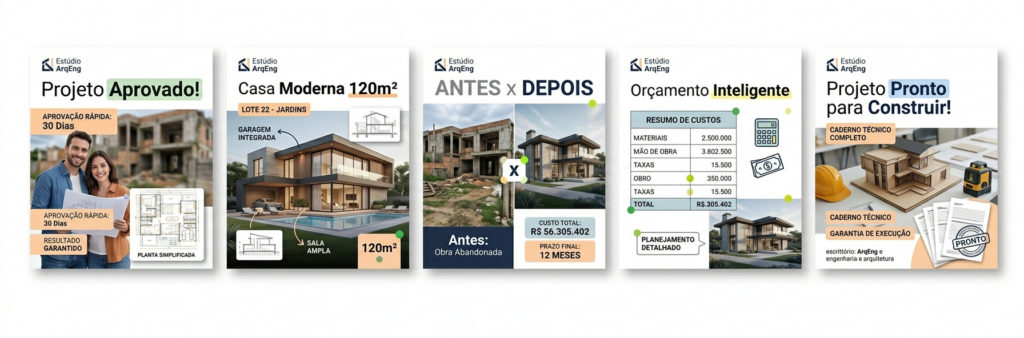 Modelos prontos de posts utilizados por escritórios para apresentar projetos, gerar autoridade e atrair novos clientes nas redes sociais.