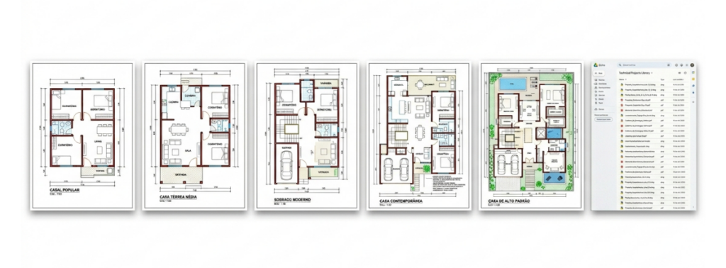 Projetos completos e editáveis, prontos para adaptação às dimensões e necessidades de cada cliente desde residências populares até projetos de padrão elevado.