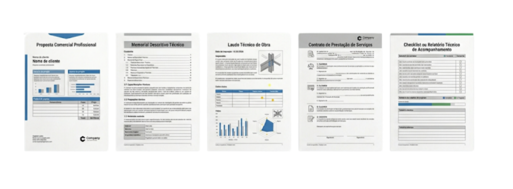 Modelos profissionais de memoriais descritivos, laudos, propostas comerciais, apresentações e checklists técnicos prontos para personalização e envio ao cliente.